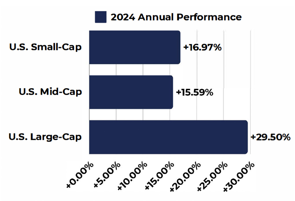 Large caps led for the year in terms of percentage gains, mostly attributed to prominent tech names extending their runs. (Information Technology, Communications, Financials, Artificial Intelligence integration). Small and mid-cap U.S. equities also had a strong year, with small-caps performing slightly better than mid-caps overall, both showing positive inflow with gains over 15% for 2024.