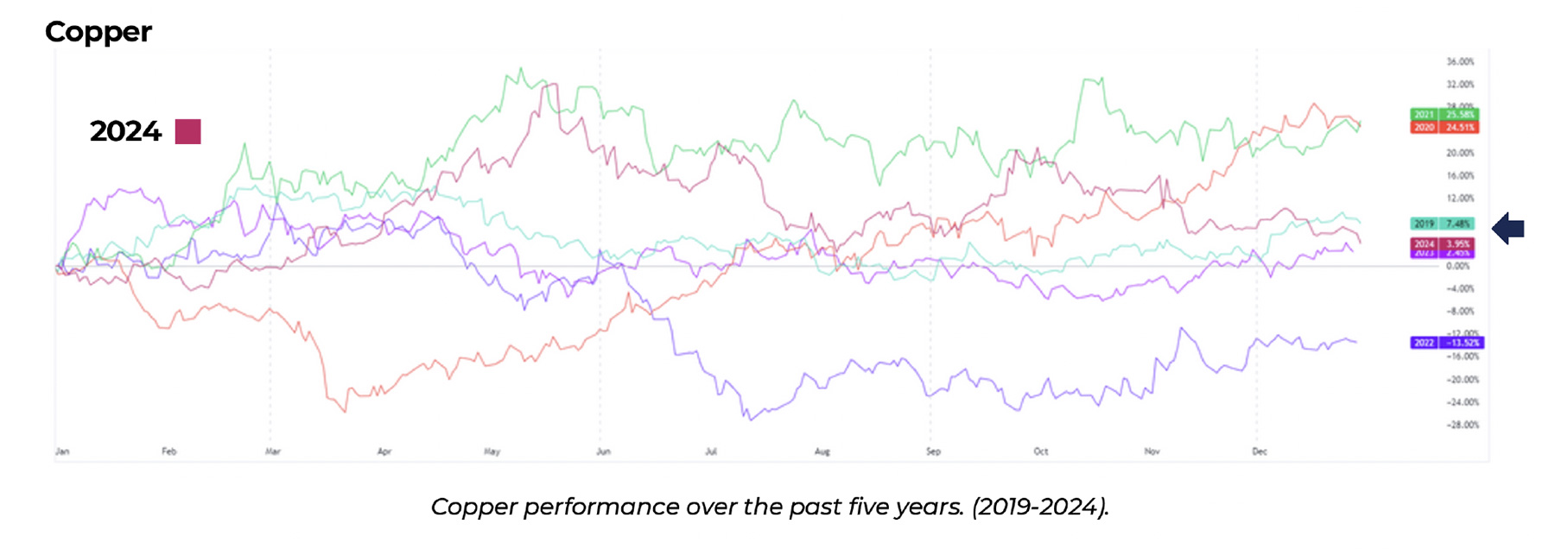 • Copper closed with annual gains of 3.95%, slightly higher than 2023's performance.