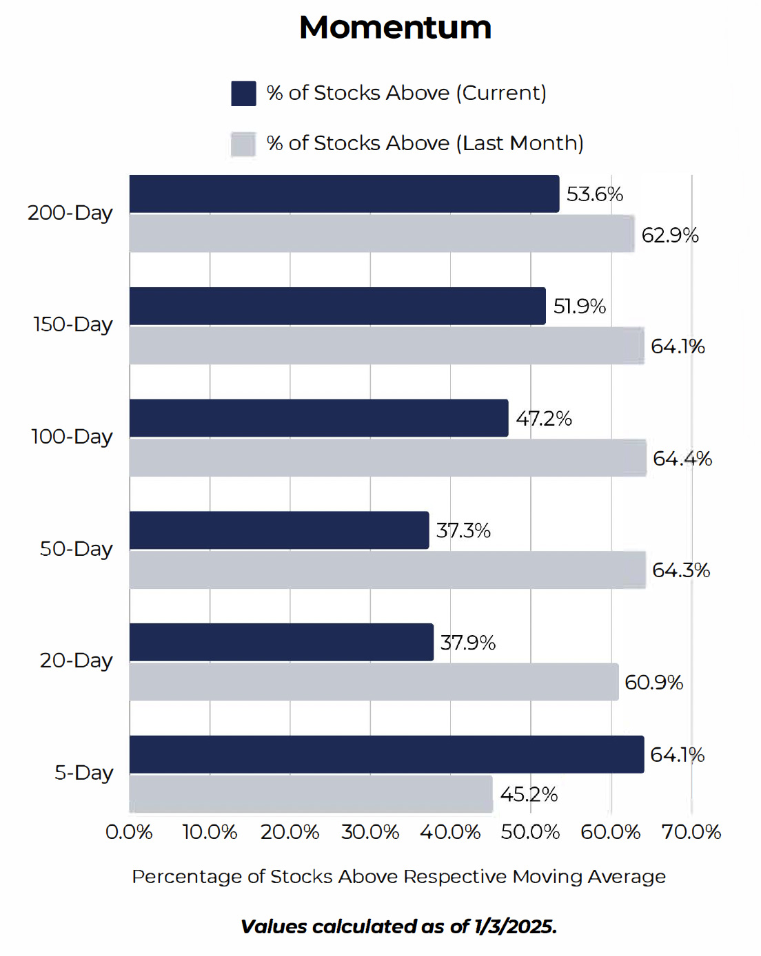 Included on the left are percentages of stocks that remain above their respective moving averages. In order to further gauge market internals, we can compare the most current reading to data from the prior month. When high percentages of stocks are above their respective moving averages, it is a positive sign of momentum.