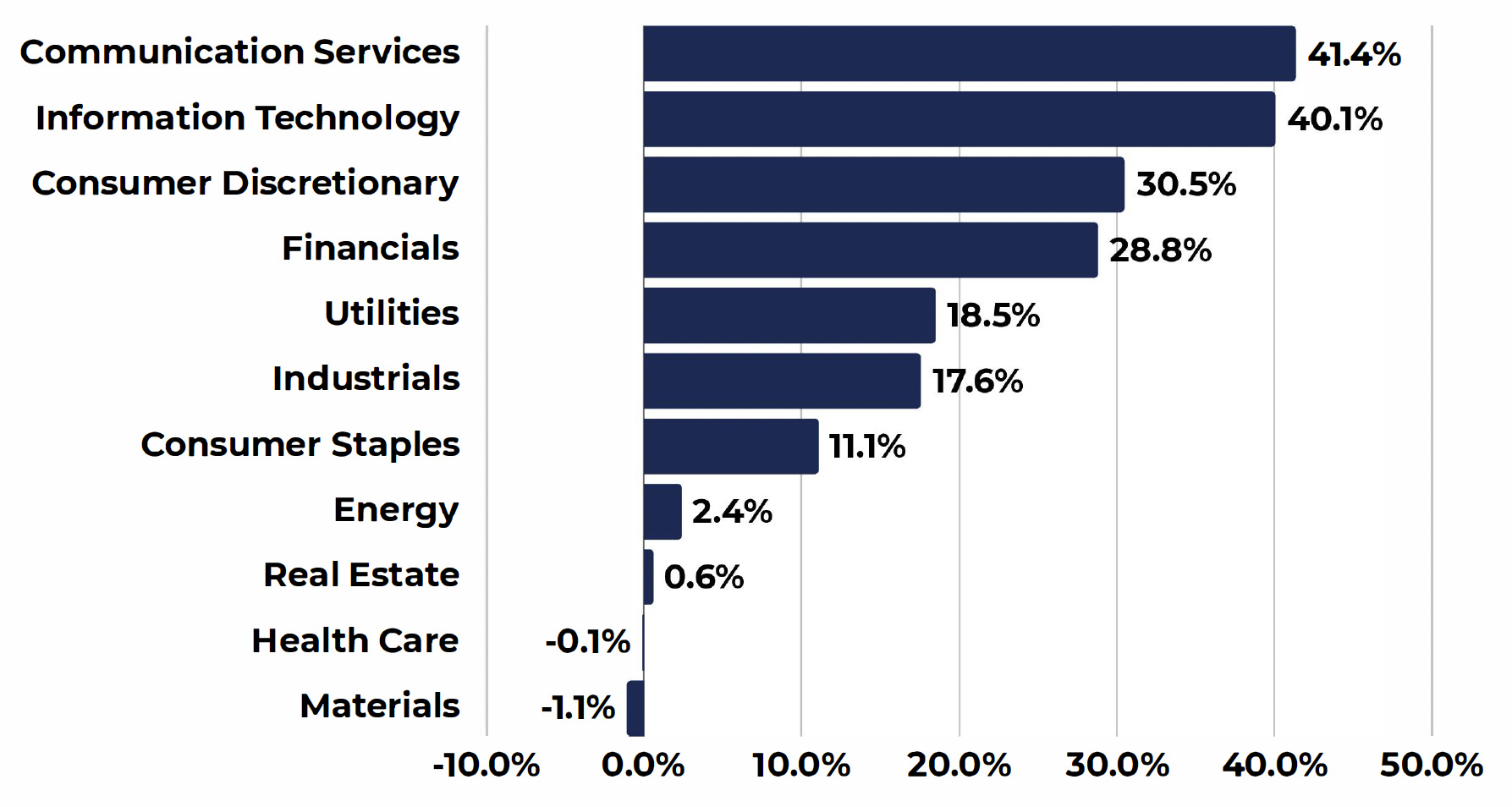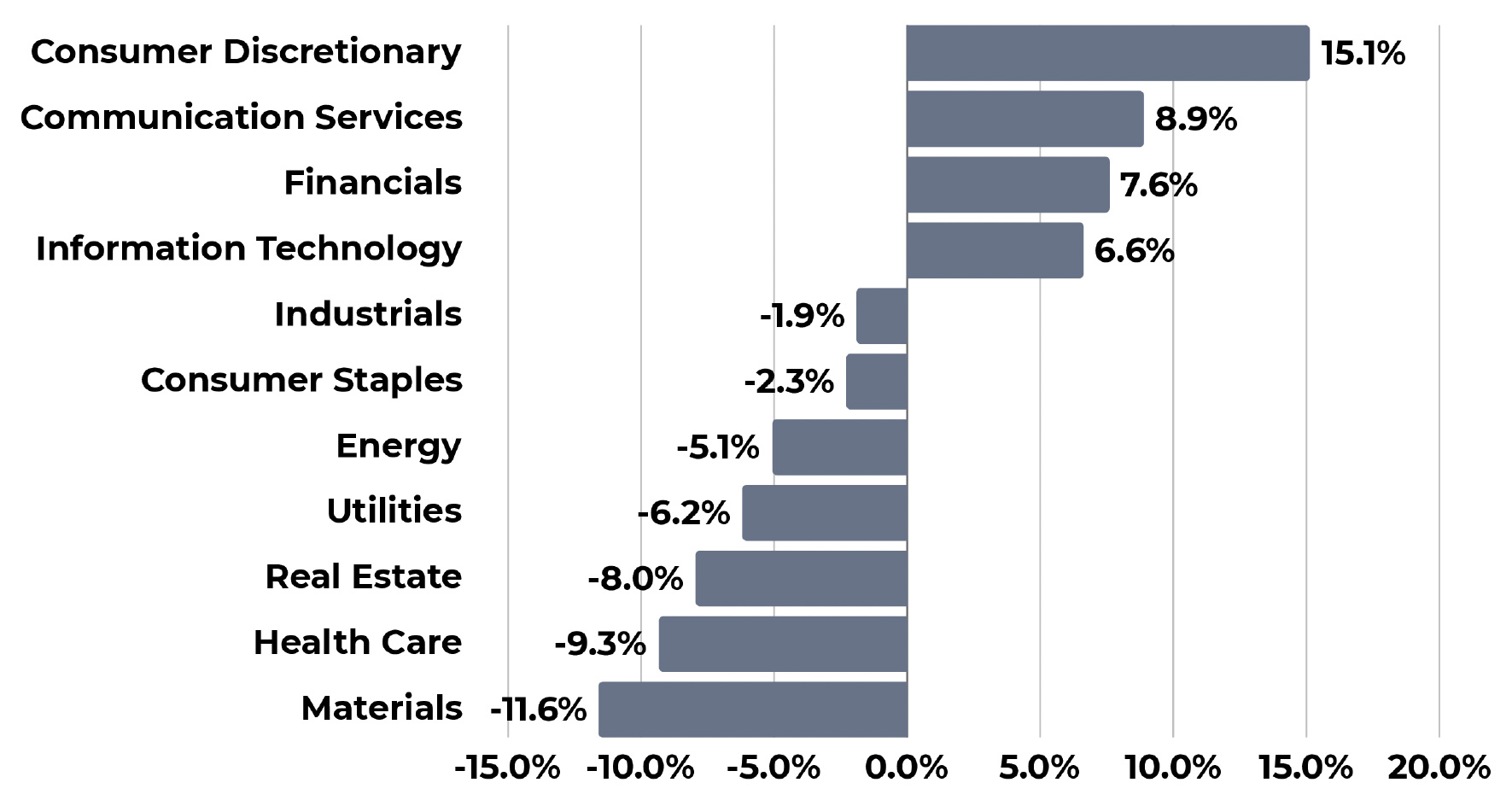 • Leading sectors for the quarter include Consumer Discretionary, Communication Services, Financials, and Information Technology, the only four sectors that were positive for the quarter.