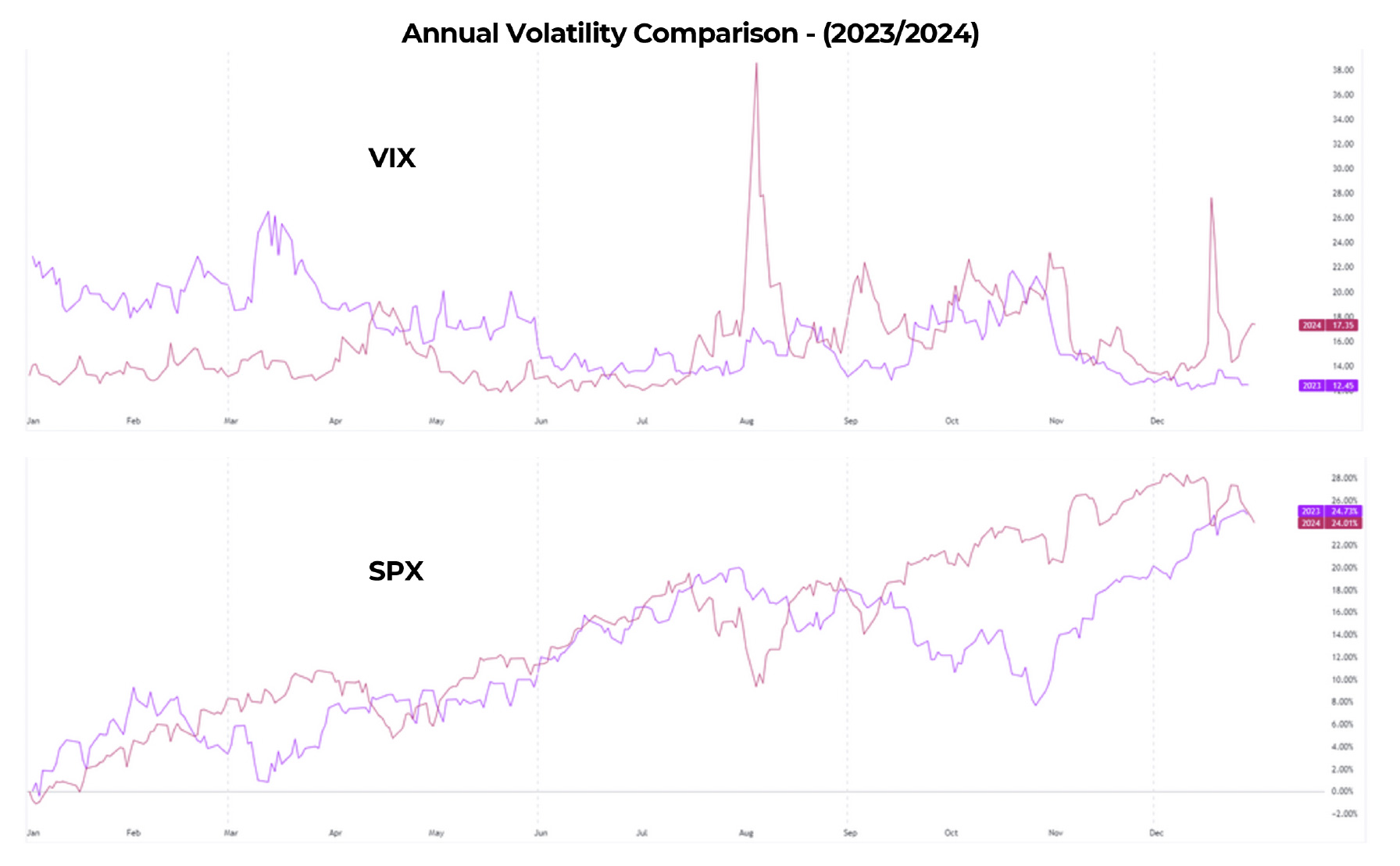 • Comparing volatility to the previous year (2023}, we can observe similarities in seasonal volatility where from August to November we see increased overall volatility and spikes in volatility.