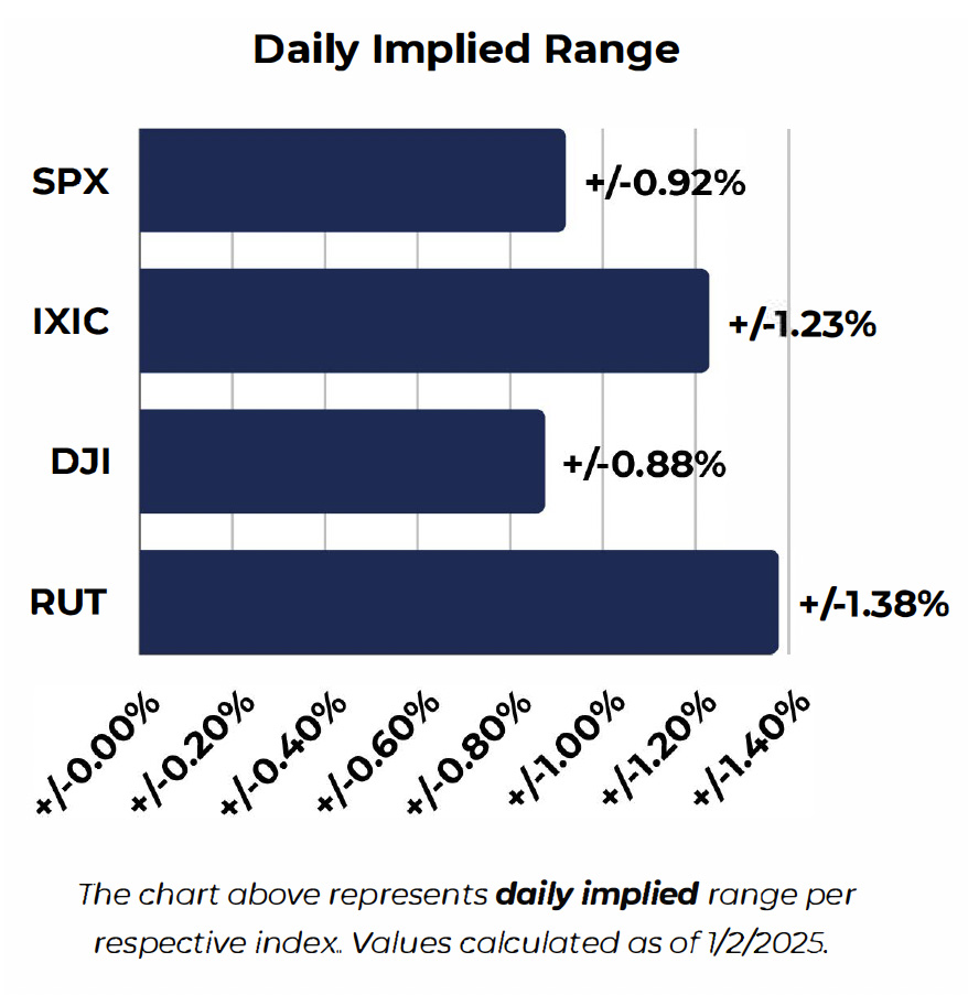 Looking at volatility in the major indices, the visuals above show underlying volatility index calculations to estimate daily implied ranges as well as 30-Day implied ranges. These are forward looking estimates.