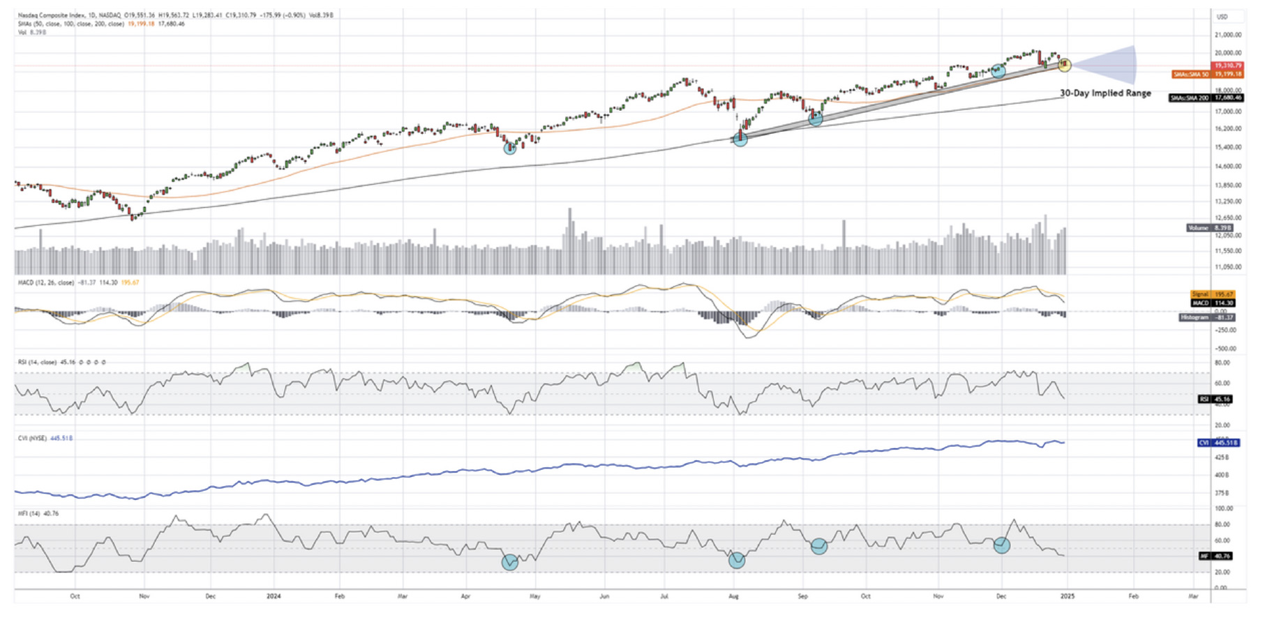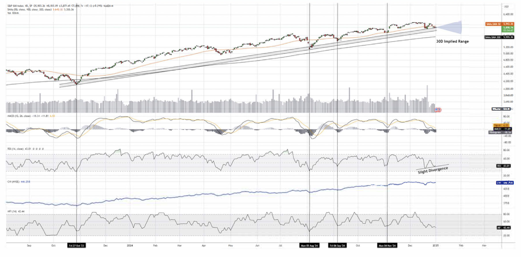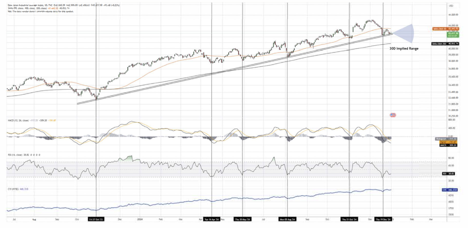The S&P 500 closed at 5,881 for the final quarter of the year, posting a gain of +2.07% for the quarter, the second-best performing index behind the Nasdaq. For the year of 2024, the index was up +23.95%, beating its annual average of approximately 10%. Overall, the index has remained resilient for the year along its respective trend line seen above, despite a drop in recent weeks of nearly 5% from record highs, the index is finding support near the trend line that has been followed since October of 2023, a positive indication of continuing this technical trend. In the coming months we expect the index to retest the highs as well as make new highs in 2025. For the following 30 days, a retest of 6,100 is a probable outcome.