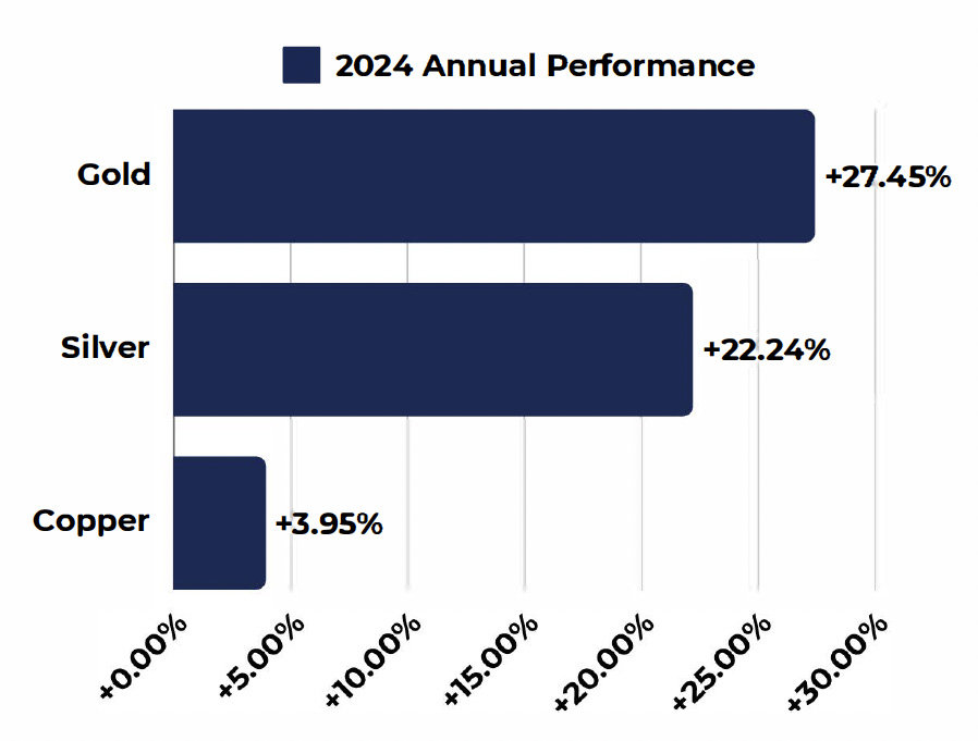 Other than equity index performance, precious metals, specifically Gold and Silver had noteworthy performance in 2024.