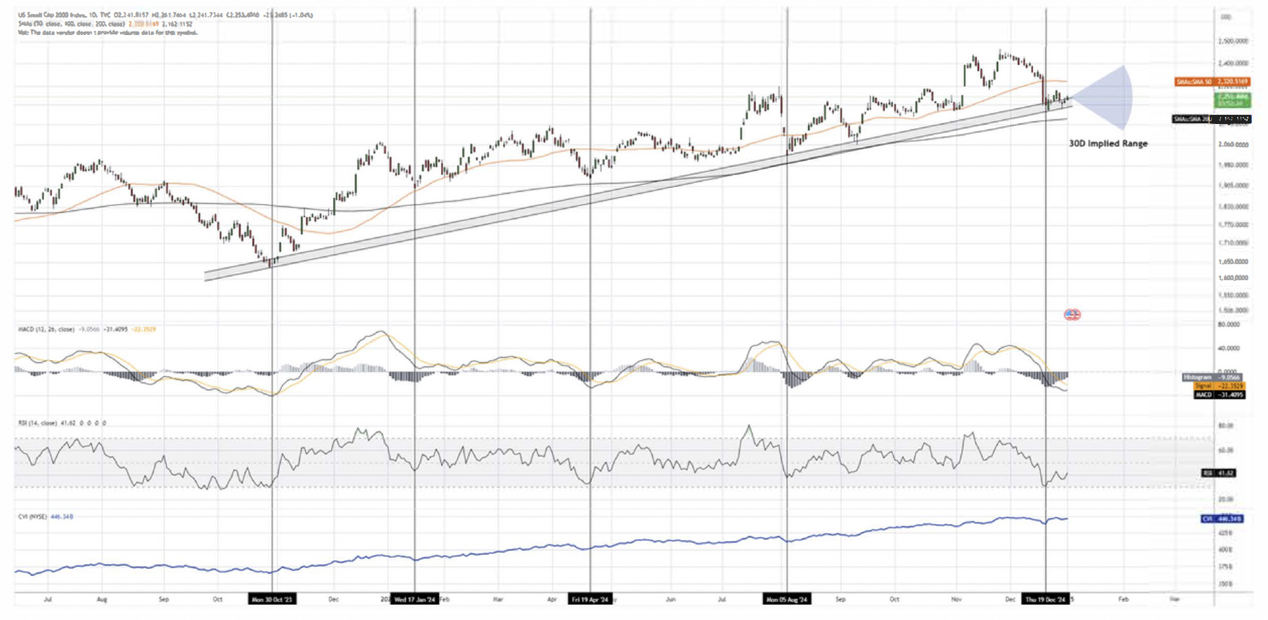 The Russel 2000 closed the fourth quarter practically flat, up +0.01% from Q3's close. For the 2024 year, the index was up +10.84%. Similar to all other major indices, the recent decline in equity markets saw the Russel drop nearly 11% from the highs of this year attributing to its flat performance for the quarter. Small capitalized equities still had a positive year, and as the Russel sits along the major trend line, a bullish reversal from current levels is a likely scenario. The Russel currently has the highest implied volatility in comparison to other indices, and is trading just above its 200-Day Moving Average. A retest of the highs in the coming months is a reality for the Russel as the sharp recent decline created an oversold territory.