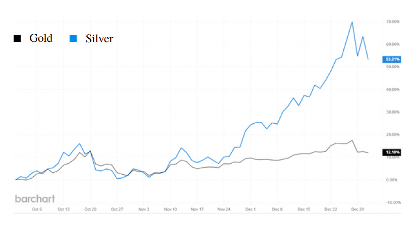 Silver’s massive move marked the second highest quarterly gain in the metals history. Surging to a high of $83.75 per ounce on December 29 . This evidently parabolic move is one that has not been seen since 1979, where silver prices doubled within the final three months of the year. Mentioning this performance, the underlying factors contributing to Silver’s push are very different this time, where the 1979 record gain was mainly driven by an artificial shortage and speculative hoarding. In 2025, the metals surge can be attributed to record demand for both industrial and technological applications including AI chip usage, data center infrastructure, as well as clean energy developments relating to Solar based power.