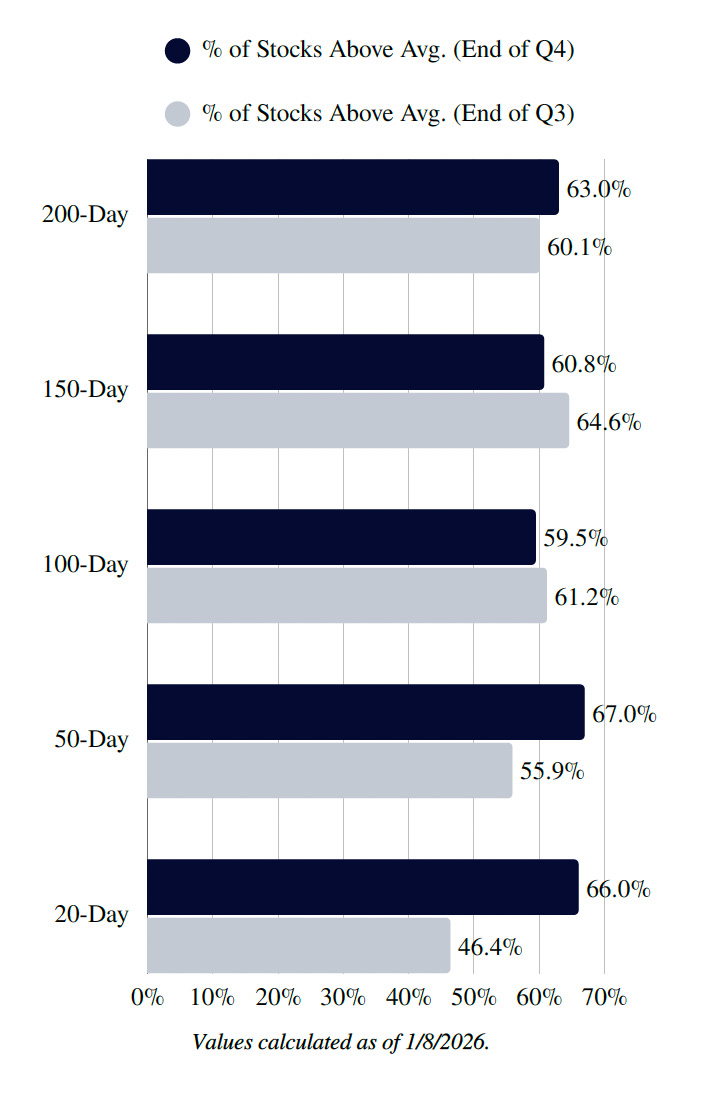This data highlights a significant expansion in market breadth as the year progressed, characterized by increasing short term momentum in Q4. While the intermediate-term participation (100-day and 150- day) saw a slight cooling or rotation, the leap in stocks trading above their 20-day average (climbing from 46.4% to 66.0%) suggests that the primary long-term bull trend remains healthy and that other sectors and equities are participating in the trend.