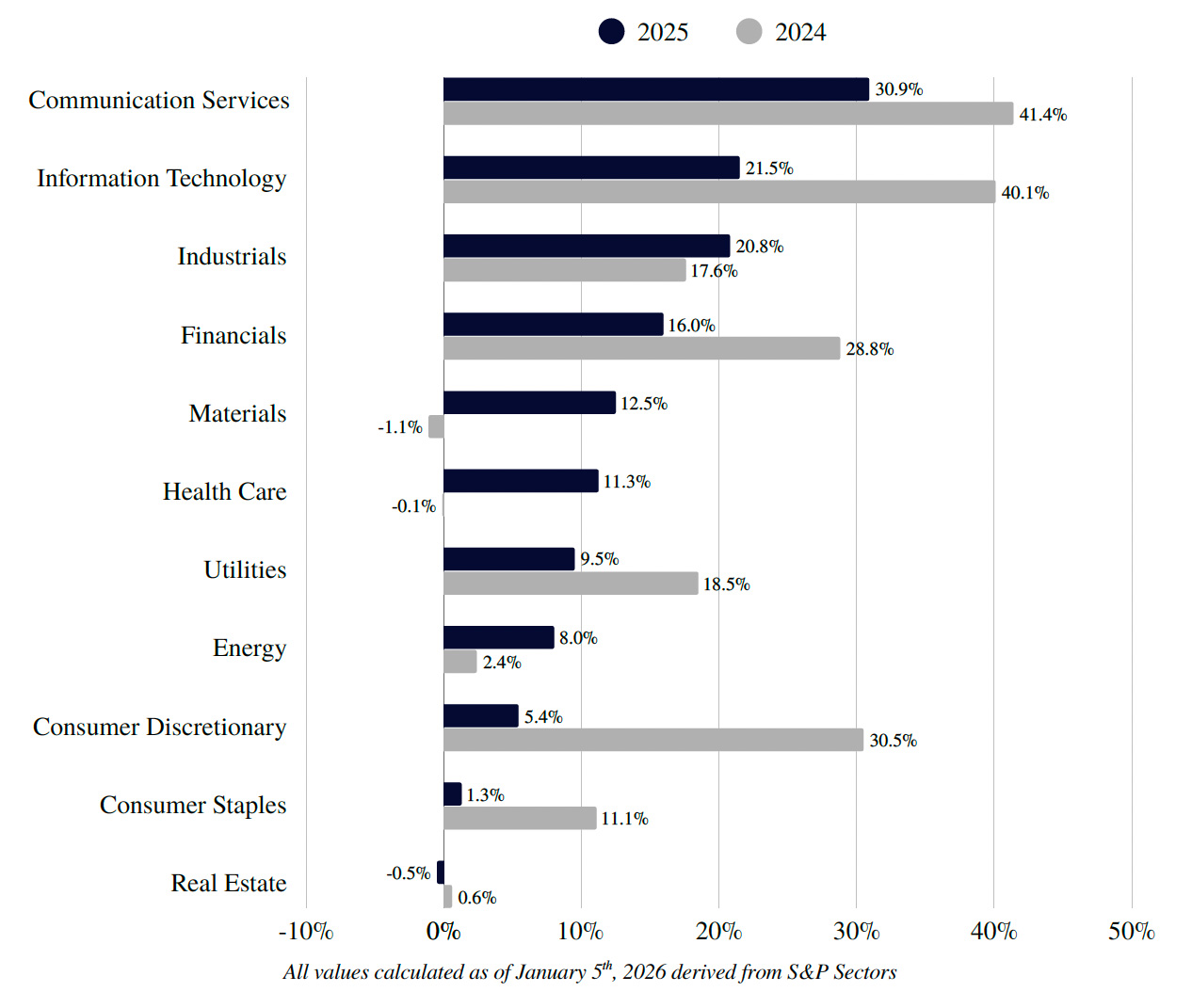 This section provides a comparative look at sector performance between 2024 and 2025. While the market's upward trend overall continued, these shifts indicate a clear rotation. Communication Services cooled from a 41% gain in 2024 to 30.9% in 2025, it remained the top performer. The most dramatic reversal occurred in Consumer Discretionary, which fell from a 31% gain to just 5.4%. Other key turnarounds include the Materials sector, which rebounded from a -1% loss to a 12.5% gain, and the Energy sector's recovery from 2% to 8.0%. The Information Technology sector saw its momentum slow from the prior year, falling from a 40% gain to 21.5% but still remaining the top performer.