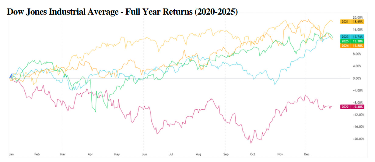 The Dow Jones returned above average gains at 13.38% for 2025, significantly stronger than the 10-year average of 11.5%, as well as higher than its 20-year average of 10.2%.