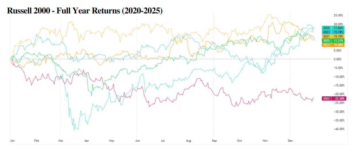 The Russell 2000 returned above average gains at 11.21% for 2025, significantly stronger than the 10-year average of 8.1%, as well as higher than its 20-year average of 8.3%.